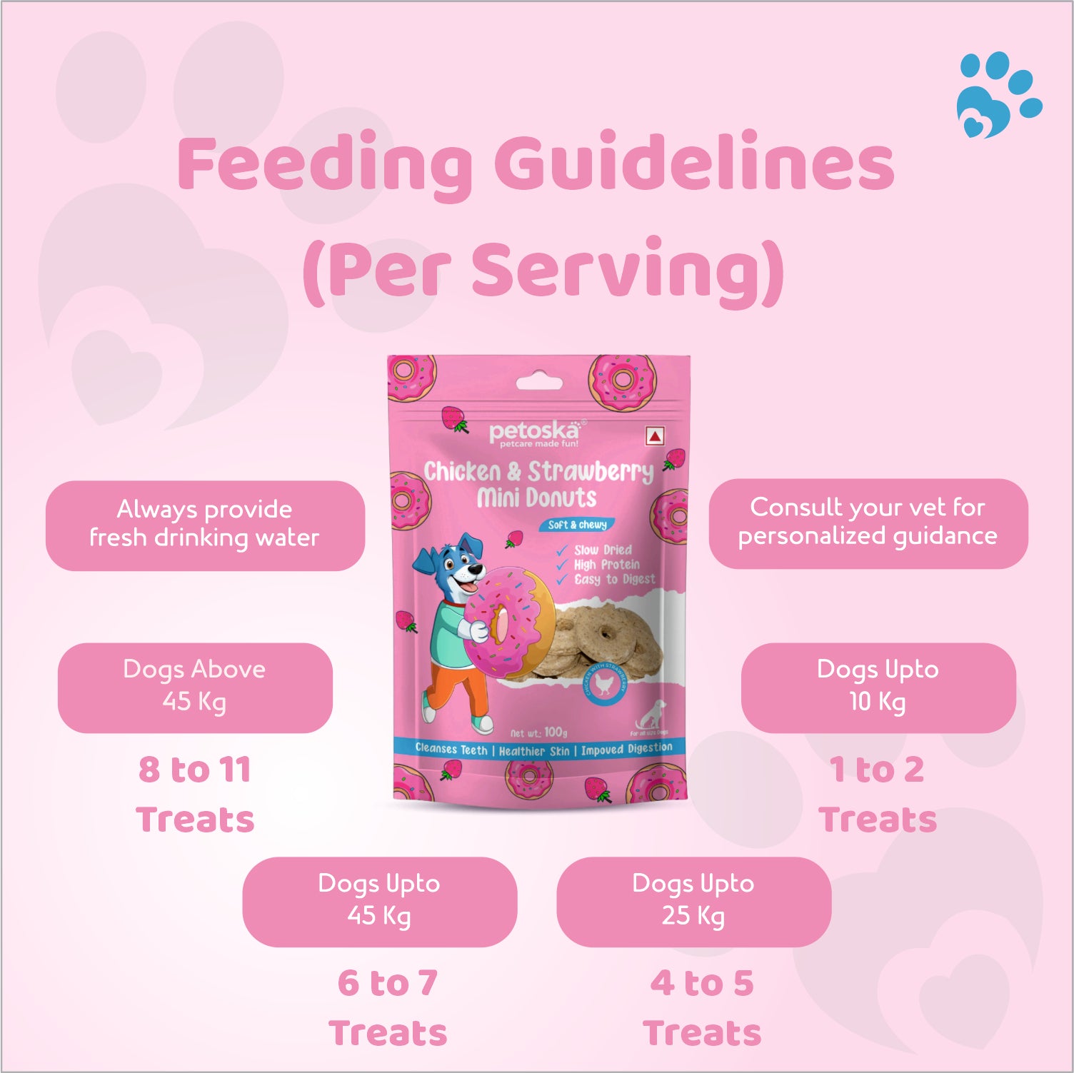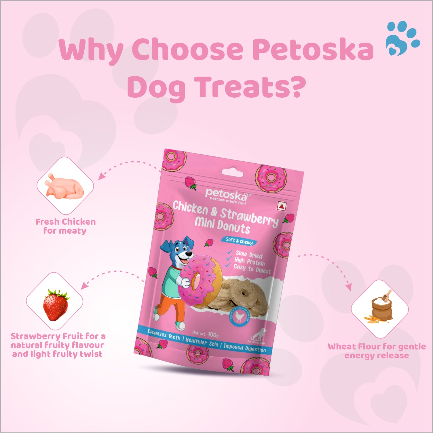 Made with strawberry, high-quality chicken and loaded with nutrition, Petoska dog treats are perfect for those tail wags. Made with natural ingredients, these treats are easy on digestion, making them a suitable snack for sensitive stomachs.