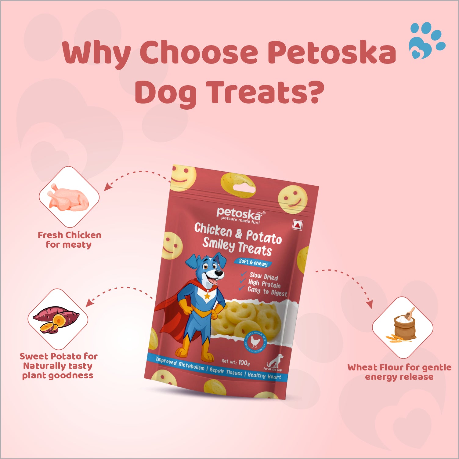 Packed with sweet potato, high-quality chicken and loaded with nutrition, Petoska dog treats are perfect for those tail wags. Made with natural ingredients, these treats are easy on digestion, making them a suitable snack for sensitive stomachs.