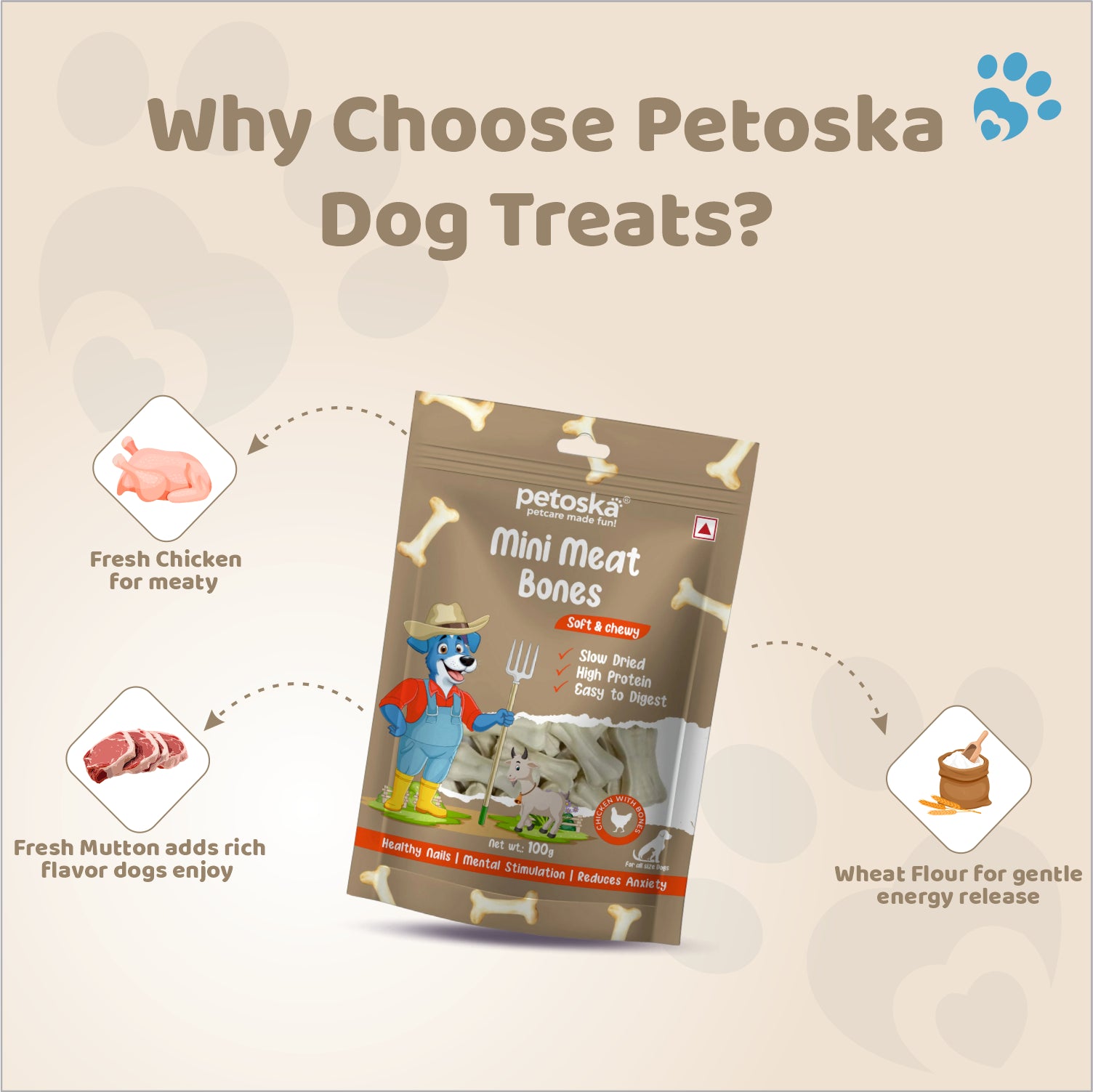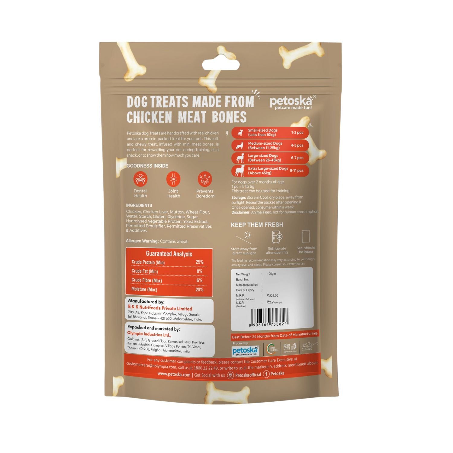 Made with high-quality chicken and loaded with nutrition, Petoska dog treats are perfect for those tail wags.Smoked to perfection, these treats with mouth watering flavour have a rich aroma & taste that dogs simply can’t resist!