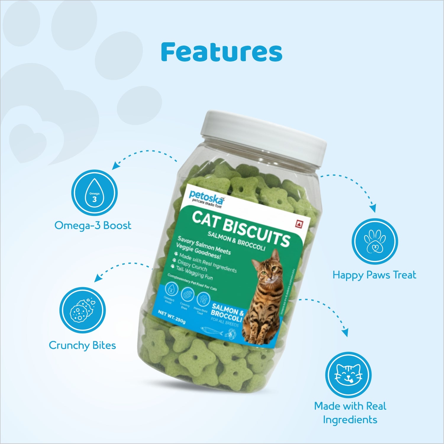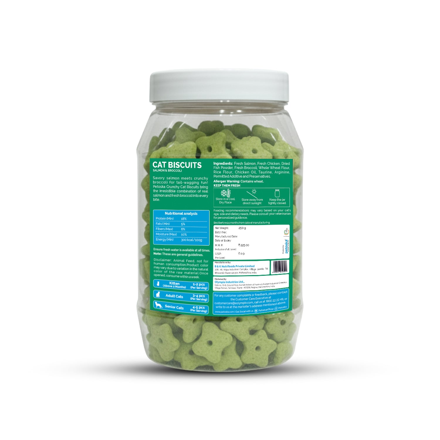Petoska Cat Biscuit Salmon & Broccoli provides a crunchy snack made with fresh salmon, chicken, dried fish powder, and broccoli. Designed as complementary cat food for kittens and adult cats, it fits daily treat schedules with element-focused ingredients. A practical choice for pet parents seeking salmon cat biscuits with a familiar fish aroma and controlled snack-style portions.