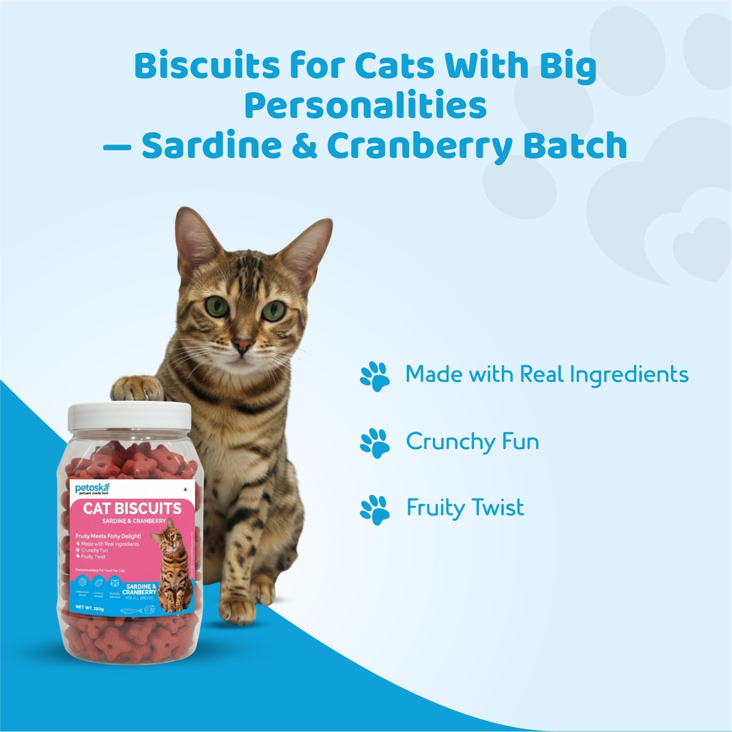 Petoska Cat Biscuit Sardine & Cranberry is crafted with sardines, chicken, dried fish powder, and cranberries to offer a distinct fish snack profile. Suitable for kittens and adults, it functions as complementary cat food for scheduled treat times. A steady choice for pet parents who prefer sardine cat biscuits with a recognisable scent and clean, crunchy structure.