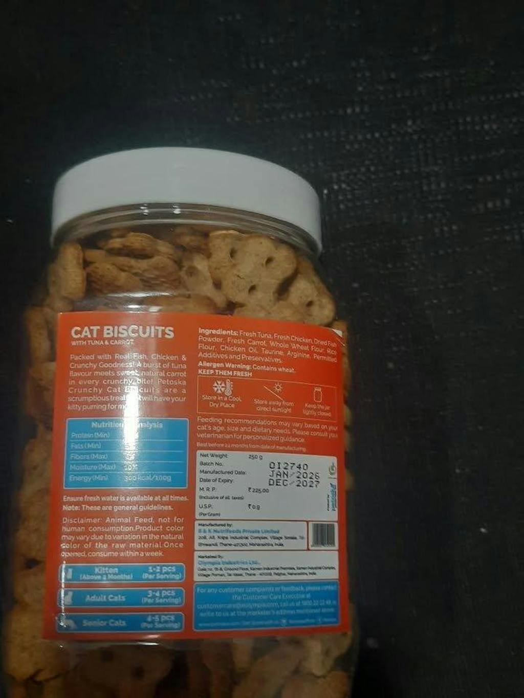 Crunchy Texture for Enjoyable Snacking: These tuna and carrot biscuits feature a crisp bite that cats enjoy. The texture provides a satisfying crunch, making it suitable for reward-based feeding, casual treating, and interactive feeding sessions. It functions as an accessible option for cat biscuits for kittens transitioning to solid snacks or adult cats who prefer dry, crunchy treats.