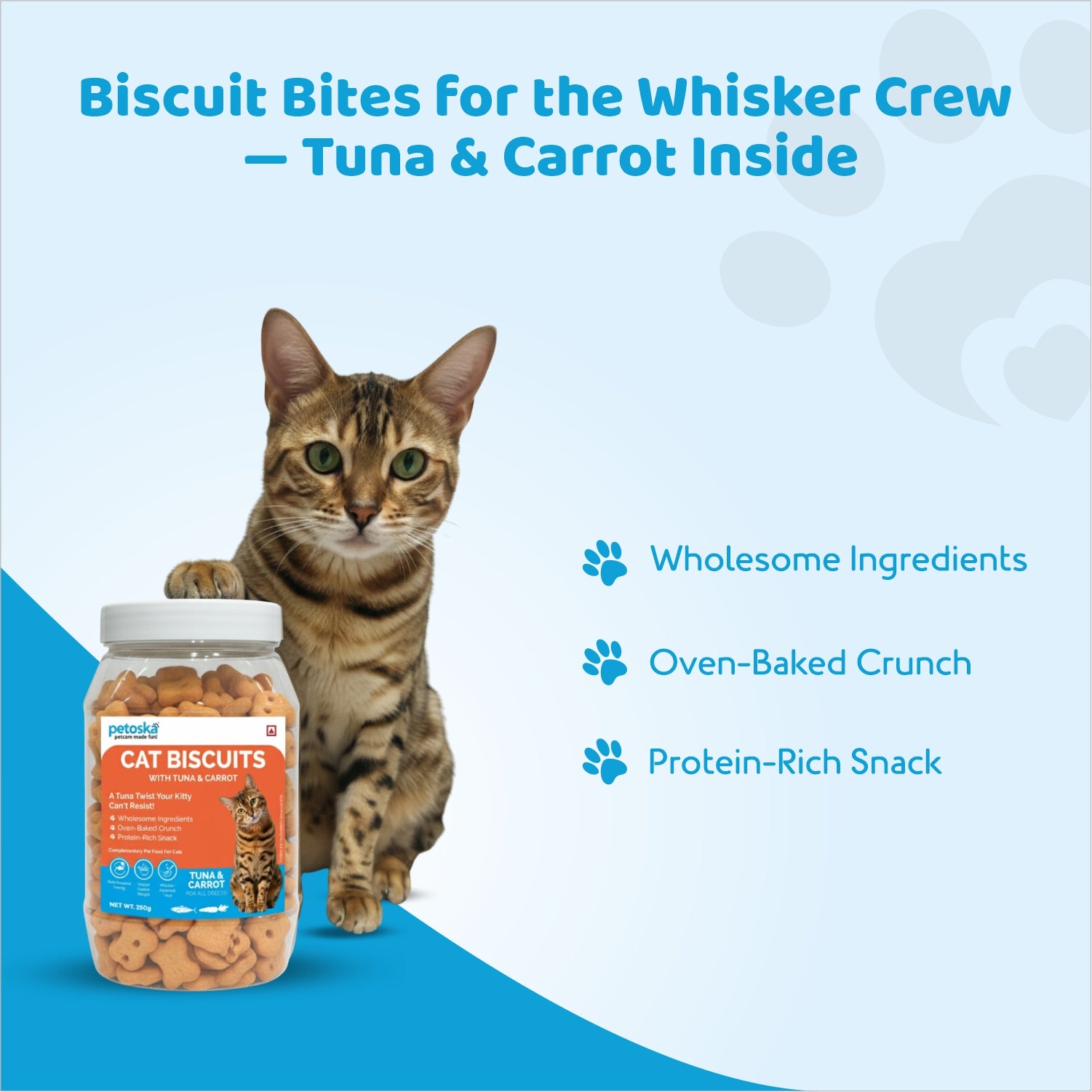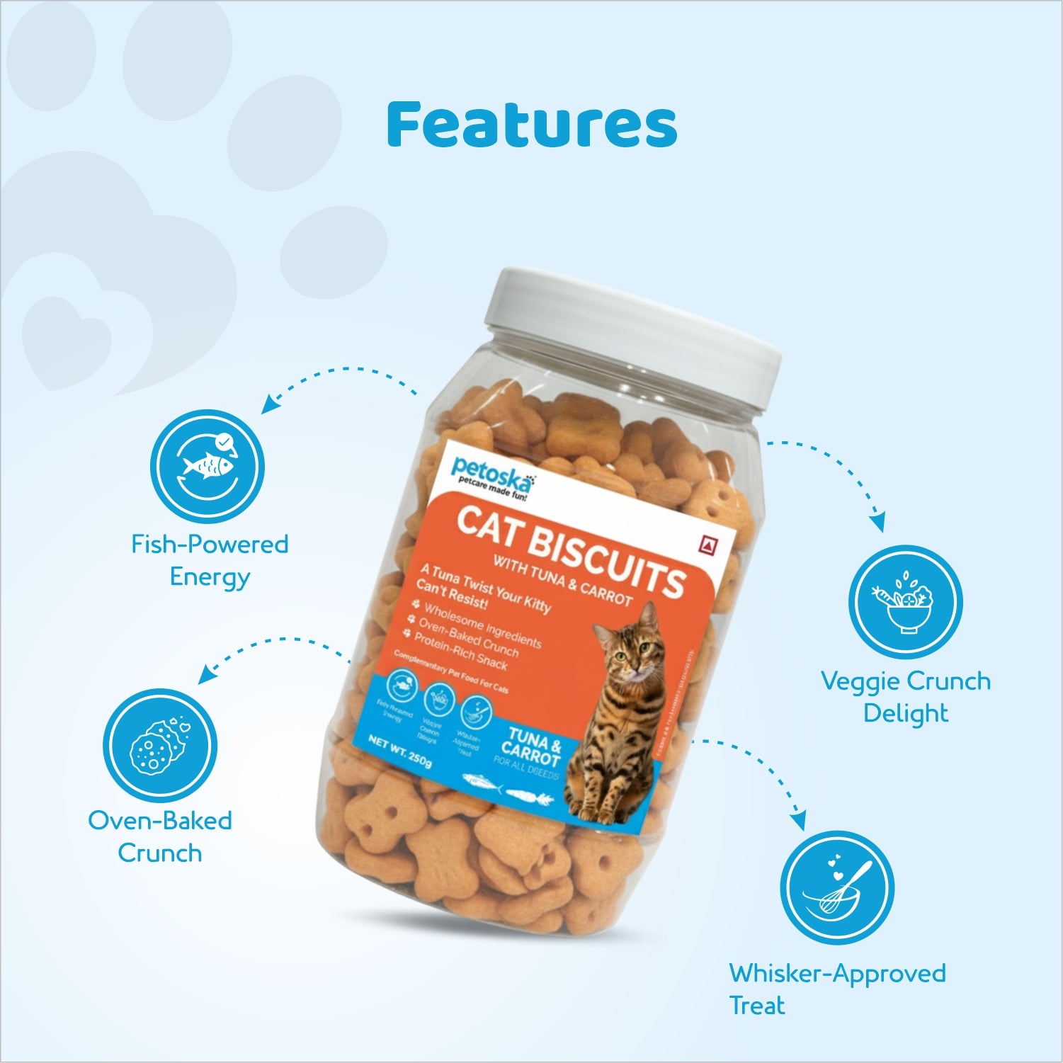 Fresh Tuna & Carrot Recipe: Petoska cat biscuit is crafted with fresh tuna, chicken, dried fish powder, and carrot, offering a balanced crunchy treat for everyday snacking. Made as complementary cat food, it supports regular feeding routines for kittens and adult cats without replacing complete meals. A suitable choice for those seeking tuna cat biscuits with simple, ingredient-led nutrition.