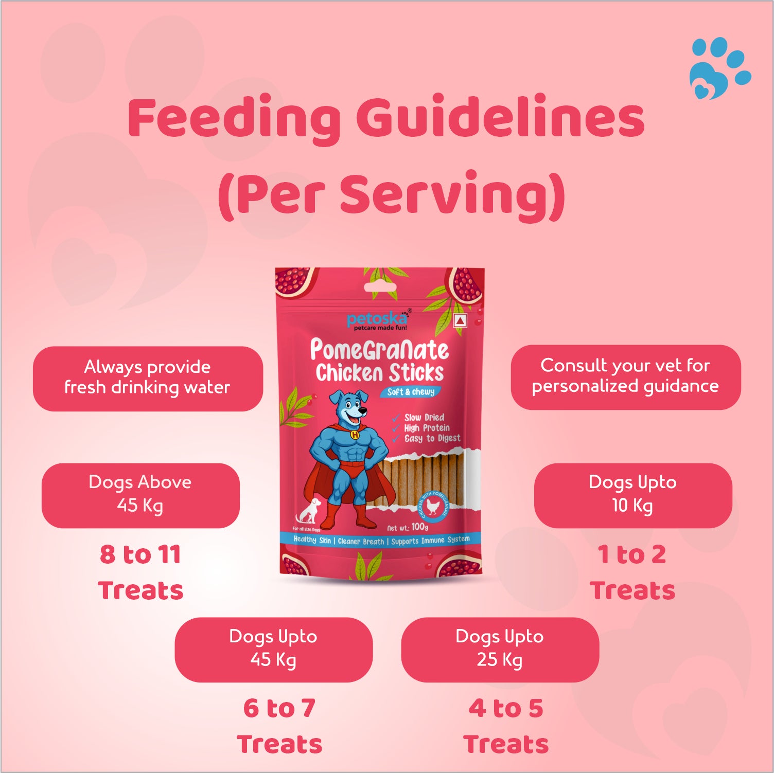 Made only with real fruit, high-quality chicken, and loaded with nutrition, Petoska air-dried dog treats sticks are perfect for those tail wags. These training dog treats are carefully developed to combine the luscious taste of real chicken with the sweet and tangy flavor of pomegranates.